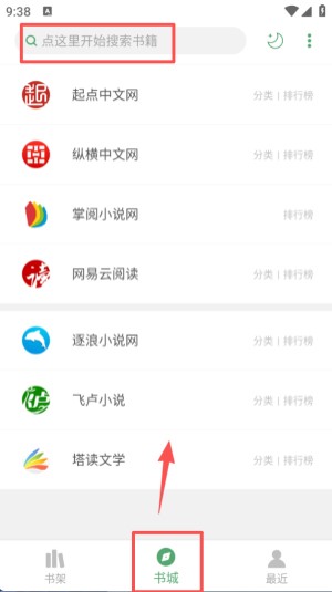 1 、书城页面顶部有搜索栏,下方列出起点中文网、纵横中文网等平台,每个平台旁标注分类与排行榜入口。