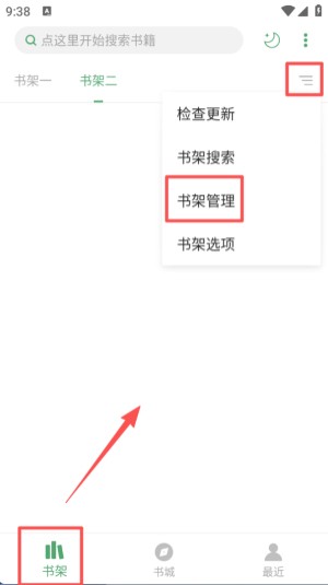 2 、书架页面顶部有书架一、书架二切换栏,点击右上角菜单按钮,可展开包含书架管理在内的功能选项。