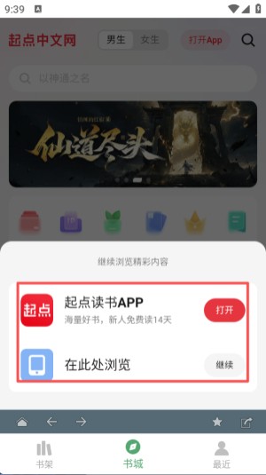3 、进入起点中文网页面,顶部有男生、女生分类标签,中间弹出提示框,提供打开 App 与在此处浏览两种选项。