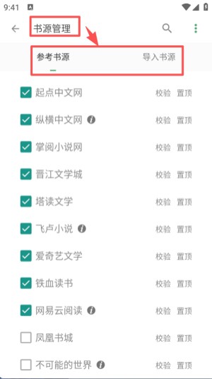 4 、书源管理页面分参考书源与导入书源标签,参考书源列表展示多个平台,每个平台旁有校验、置顶功能按钮