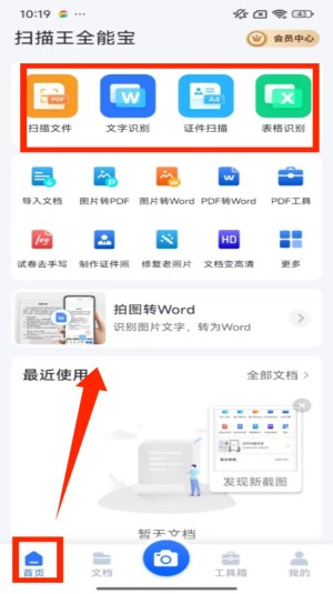 1 、首页顶部排列扫描文件、文字识别等核心功能按钮,中间展示 “拍照转 Word” 等常用工具,底部有功能导航栏。