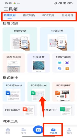 3 、工具箱页面分扫描识别、格式转换等板块,格式转换区包含 PDF 转 Word、Excel 等工具,覆盖多种格式互转需求。