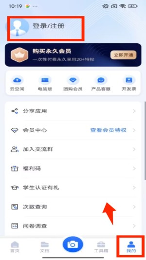 4 、“我的” 页面顶部有登录和注册入口,下方列出云空间、会员中心等功能,可查看会员特权与参与福利活动。