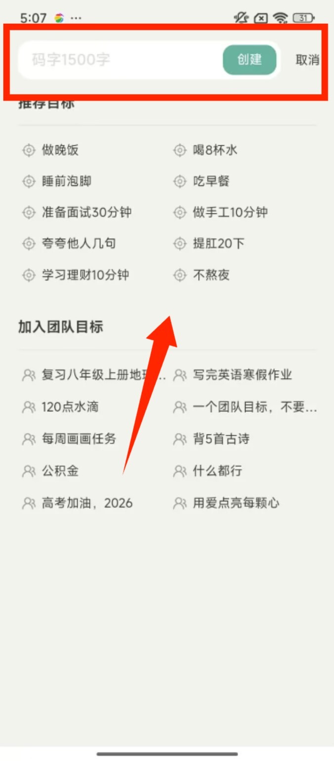 1、在目标创建页面,输入 “码字 1500 字” 后点击 “创建”,即可生成对应的待完成目标。