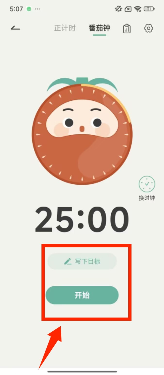 2、进入番茄钟界面,先在 “写下目标” 处填写内容,再点击 “开始” 按钮启动计时。