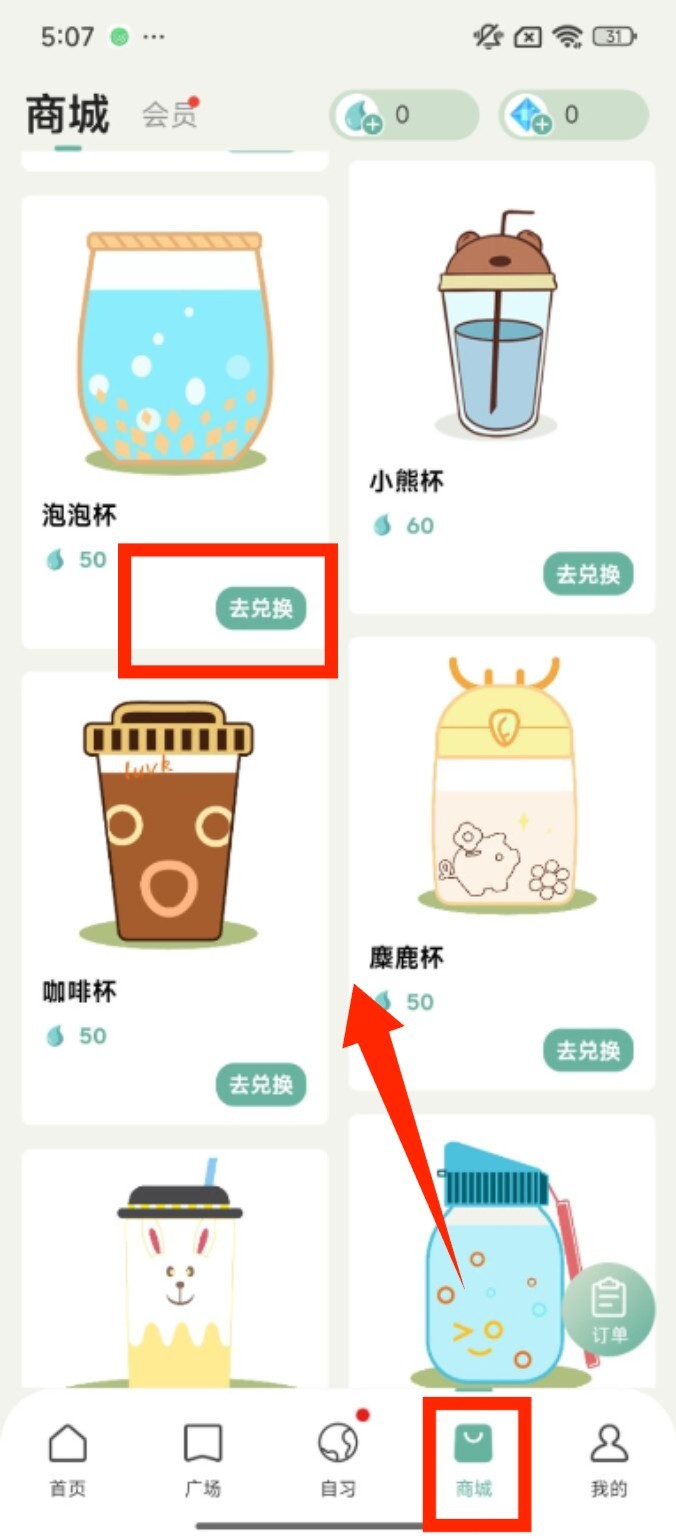 3、切换到底部 “商城” 页面,找到 “泡泡杯” 后点击对应的 “去兑换” 按钮,进入兑换界面。