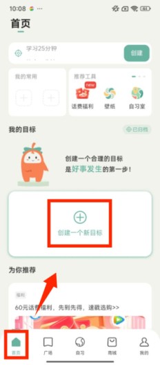 1、进入软件首页,找到 “创建一个新目标” 按钮,点击后可进入目标创建界面,同时能看到常用工具与推荐内容。