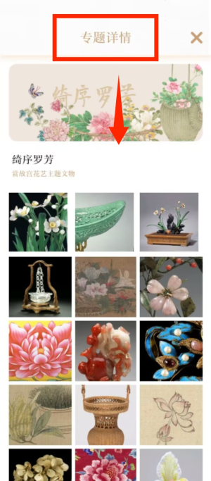 2、进入专题详情页面,能看到 “绮序罗芳” 等花艺主题文物集合,展示了各类花卉相关的文物图片。