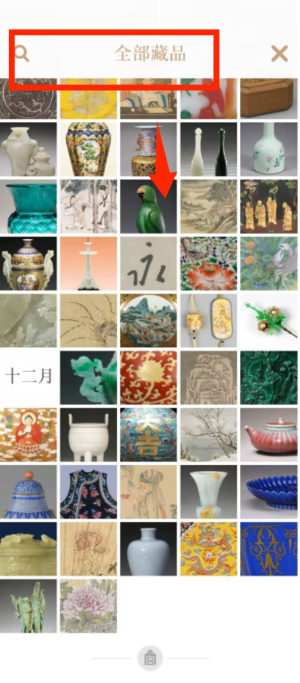 3、打开全部藏品页面,可看到众多故宫藏品的缩略图,涵盖瓷器、器物、书画等不同类型的文物。
