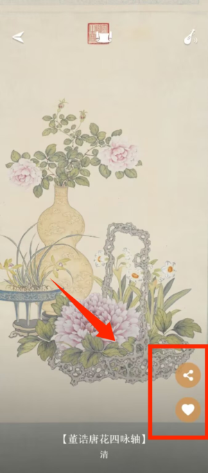 4、查看单件藏品详情,如《董诰唐花四咏轴》,页面右侧有分享、收藏按钮,可对藏品进行互动操作。