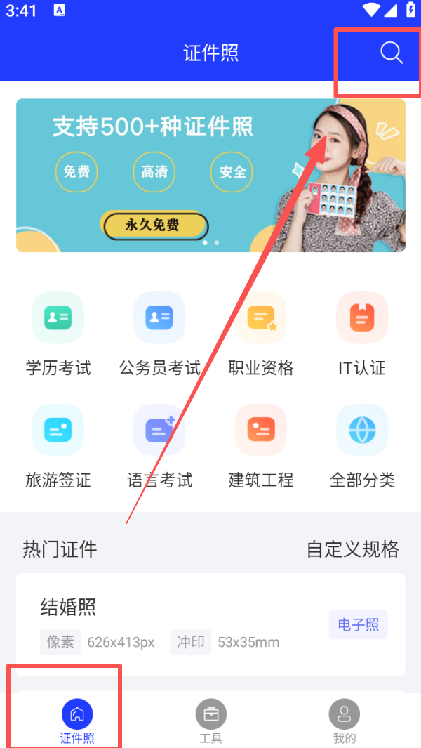 1、在证件照页面,点击右上角搜索图标,可查找所需的证件照类型。