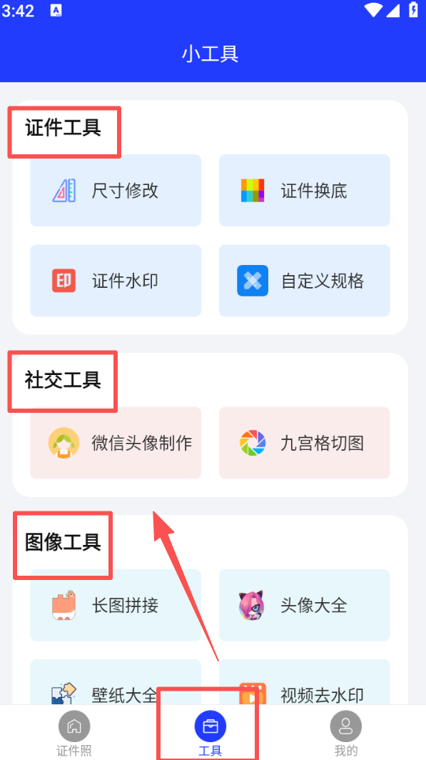 2、切换到工具页面,可使用证件工具、社交工具、图像工具等多种功能。