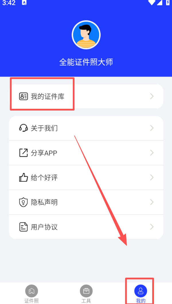 3、进入 “我的” 页面,点击 “我的证件库”,可查看保存的证件照。