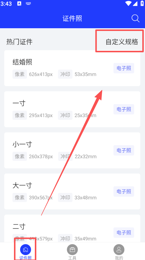 4、回到证件照页面,点击 “自定义规格”,可根据需求设置证件照规格。