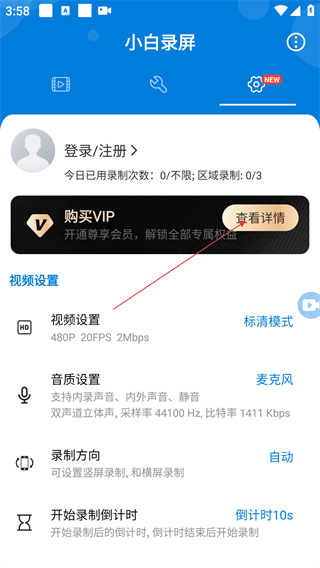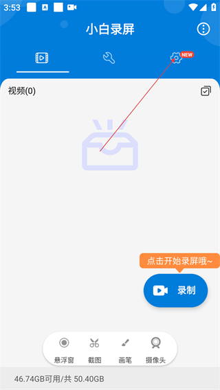 1、进入【小白录屏】主界面,可开启【悬浮窗】【截图】等功能,点击右上角【设置】进入页面。