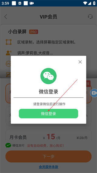 4、点击【下一步】后会弹出【微信登录】窗口,需登录微信后才能继续完成VIP会员的购买流程。