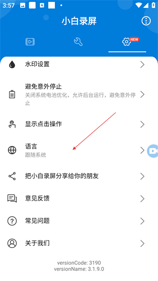 1、进入【小白录屏】主界面,可开启【悬浮窗】【截图】等功能,点击右上角【设置】进入页面。