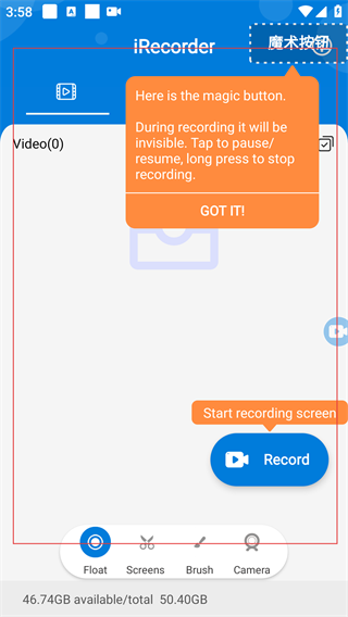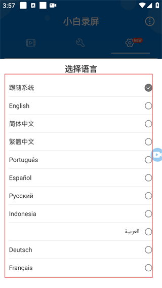 4、切换语言后界面会更新为对应语种,录屏时【魔术按钮】可实现暂停/恢复、长按停止等操作。