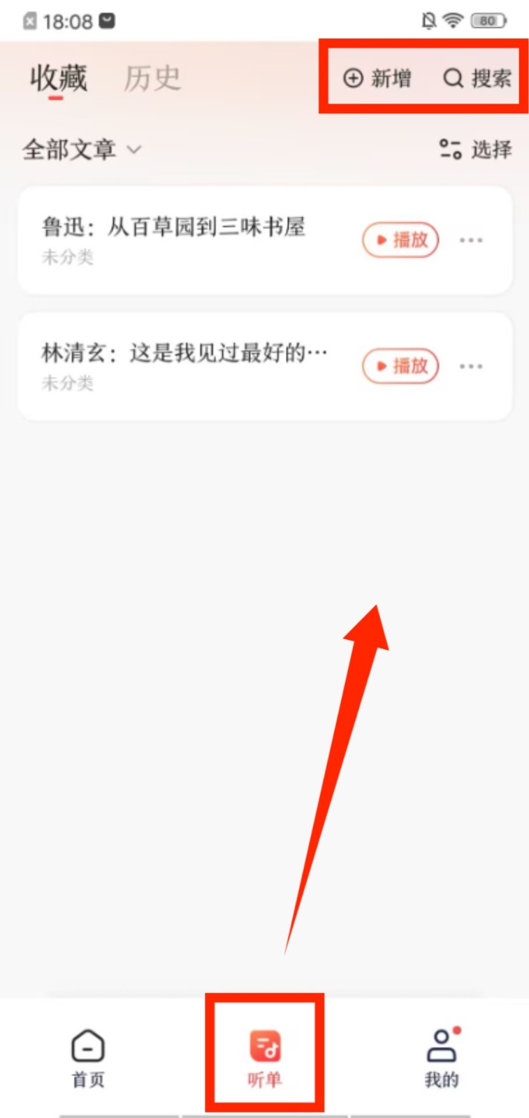 2、切换到听单页面,点击 “新增” 按钮添加内容,在收藏列表里选择文章,点击 “播放” 开启朗读。