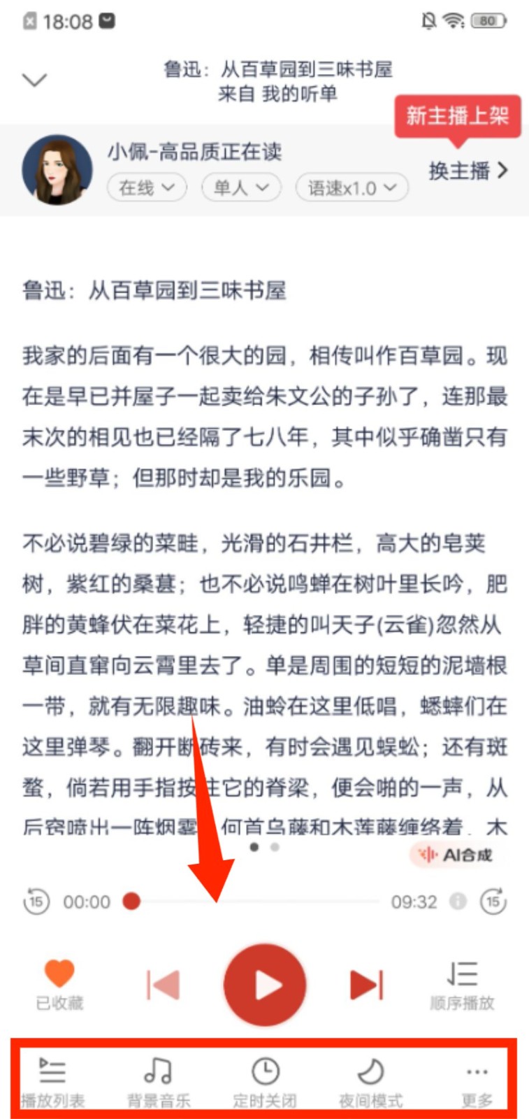 3、进入朗读播放页,可调整语速、切换主播,还能使用定时关闭、夜间模式等功能优化收听体验。