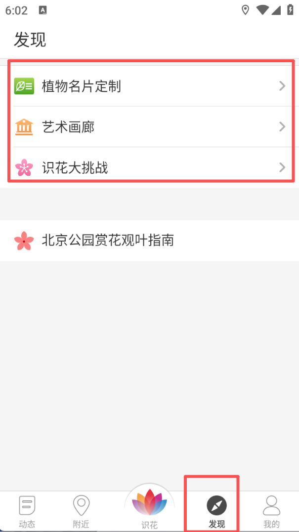 3、点击底部 “发现” 栏位,进入后可找到植物名片定制、识花大挑战等功能入口,参与相关互动项目。