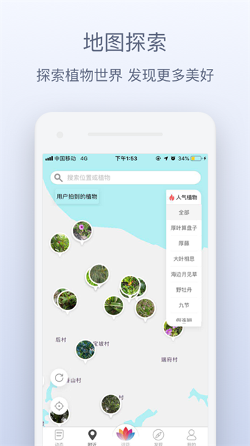 2、选中底部 “附近” 按钮,进入地图页面后,能通过搜索栏查找位置或植物,查看周边区域的植物分布。