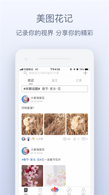1、点击底部 “动态” 选项,进入后可切换花记、鉴定等分类,浏览植物相关视频与用户分享的植物内容。