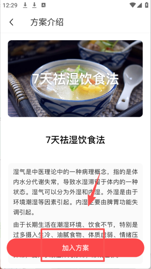 3、在方案介绍页面,了解“7天祛湿饮食法”,点击“加入方案”。