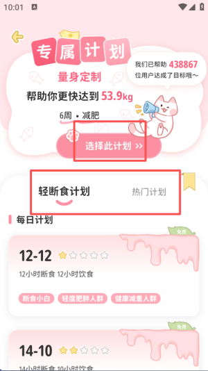 2、在专属计划页面,能看到量身定制的减肥计划,点击 “选择此计划” 可选定轻断食等热门计划。