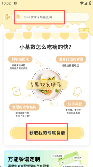 3、进入饮食推荐页面,顶部可查询食物热量,点击 “获取我的专属食谱” 能得到适配的饮食方案。