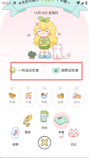 4、在记录页面,可通过 “一句话记饮食” 或 “拍照记饮食” 功能,快速记录每日的饮食相关信息。