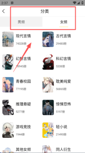1 、分类页面分男频、女频两类,展示现代言情、古代言情等细分类别,每个类别标注对应作品数量。