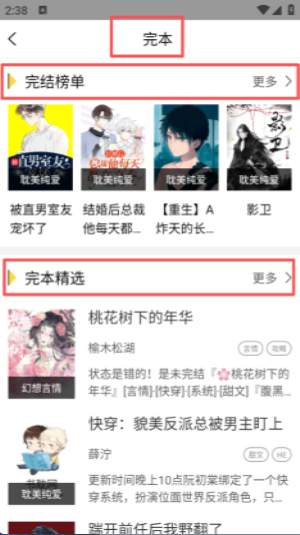 2 、完本页面包含完结榜单与完本精选板块,各板块右侧有 “更多” 入口,展示已完结的作品列表。