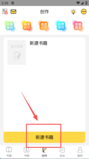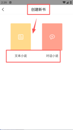 4 、创建新书界面顶部显示 “创建新书” 标题,下方以不同颜色卡片区分文本、对话两种小说创作形式。