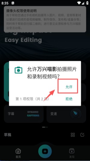 1、点击底部 “首页” 选项,在页面中找到 “拍照” 按钮,点击后会弹出摄像头权限申请弹窗,选择 “允许” 即可启用。