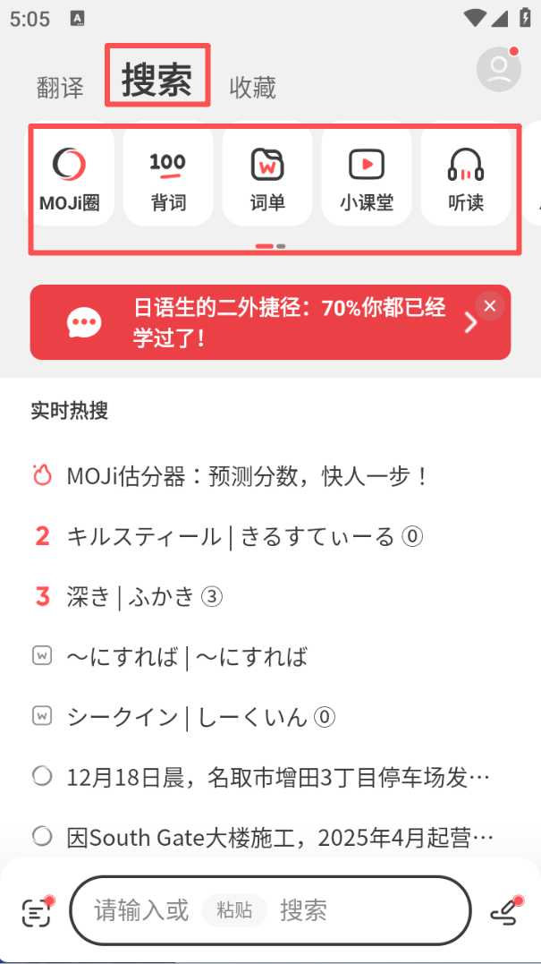 1、点击顶部 “搜索” 选项,可看到 MOJi 圈、背词等功能入口,还能查看实时热搜内容,辅助内容检索。