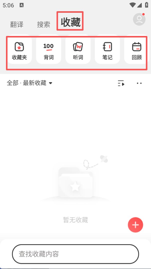 3、进入 “收藏” 页面,可通过收藏夹、背词等功能管理内容,还能借助笔记、回顾功能梳理积累的信息。