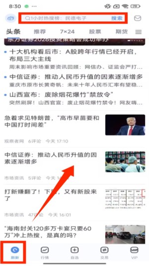 1、进入 “新闻” 页面,在顶部搜索框输入关键词后点击 “搜索”,即可查看对应的财经资讯、市场动态等内容。