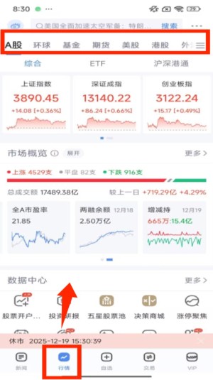 2、点击底部 “行情” 选项,进入后选择 “A 股” 板块,能看到上证指数、深证成指等指数数据,以及市场概览信息。