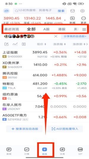 3、切换至 “自选” 页面,可查看最近浏览的股票、指数等内容,还能通过 “搜索添加自选股” 按钮添加关注标的。