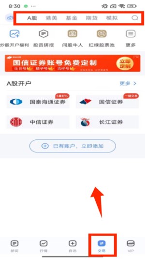 4、点击底部 “交易” 选项,进入后可看到 A 股开户入口,以及国泰海通证券、国信证券等券商的开户通道供选择。