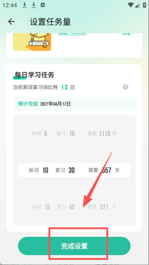 2、设置任务量,点击“完成设置”按钮,设定每日新词复习词比例。