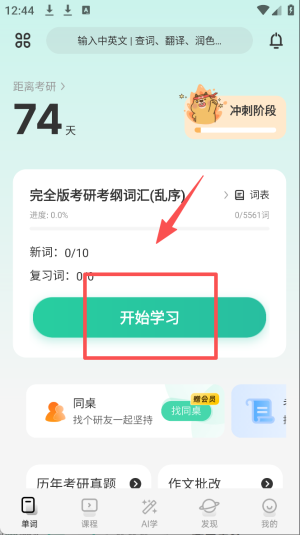 3、开始学习,点击“开始学习”按钮,进入单词学习模式。