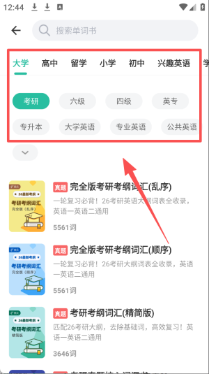 1、选择单词书,点击“大学”分类,选择适合你的单词书。