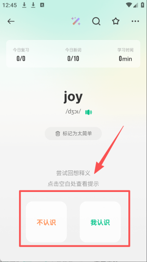 4、测试记忆,点击“我认识”或“不认识”按钮,测试单词记忆效果。