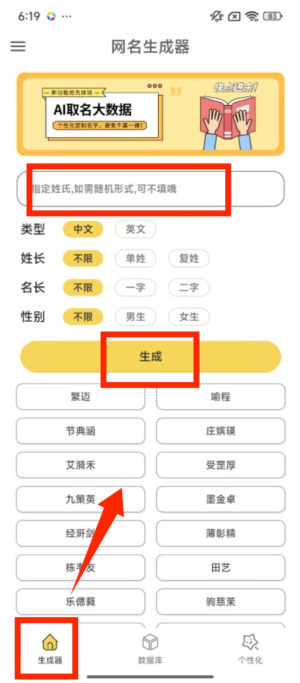 1、点击底部 “生成器” 选项,在输入框填写定制姓氏(也可不填),选择类型、姓长等条件后,点击 “生成” 获取网名。