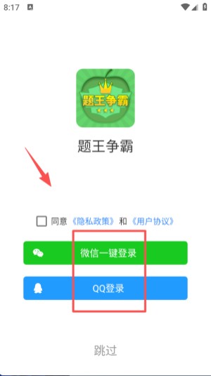 1、打开 “题王争霸” 后,勾选同意协议,可选择微信或 QQ 方式完成登录,也能点击跳过暂不登录。