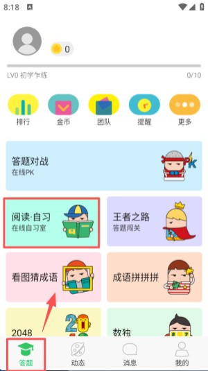 2、点击底部 “答题” 选项,在页面中找到 “阅读自习” 板块,点击即可进入对应的在线自习页面。