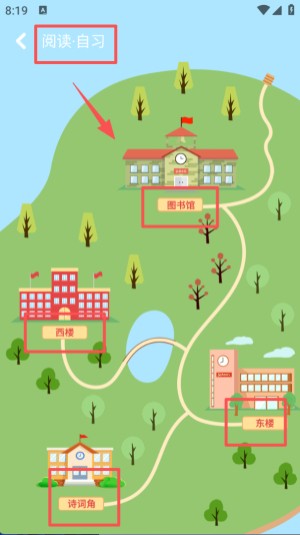3、进入阅读自习页面后,能看到图书馆、西楼、东楼、诗角等不同场景入口,可按需选择进入。