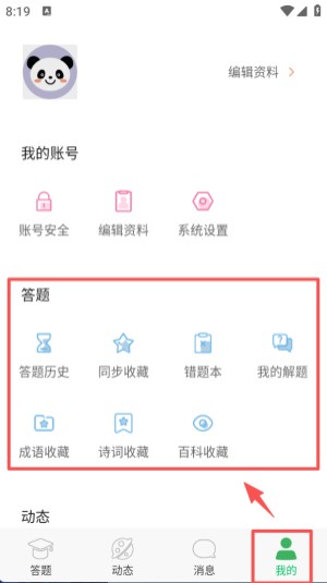4、点击底部 “我的” 选项,在页面中能看到答题相关功能,包括答题历史、同步收藏等内容入口。